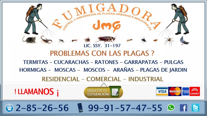 FUMIGADORA JMG ES UNA EMPRESA CON MAS DE 20 AÑOS DE EXPERIENCIA EN EL CONTROL INTEGRAL DE PLAGAS DAMOS SERVICIO A : CASA HABITACION, ESCUELAS, RESTAURANTES, CANTINAS, EXPENDIOS, BODEGAS, ALMACENES , TIENDAS, HOTELES, ETC. CONTROLAMOS : CUCARACHAS, RATONES, TERMITAS, MOSCAS, MOSCOS, GARRAPATAS, PULGAS, INSECTOS DE JARDIN, HORMIGAS, ETC. TRABAJAMOS TODOS LOS DIAS DEL AÑO SI CONTRATA EL SERVICIO DE CONTROL DE TERMITAS TENDRA UN DESCUENTO DEL 20% SI CONTRATA EL SERVICIO DE CONTROL INTEGRAL DE PLAGAS ( FUMIGACION ) TENDRA EL 15% DE DESCUENTO LLAMENOS SIN COMPROMISO