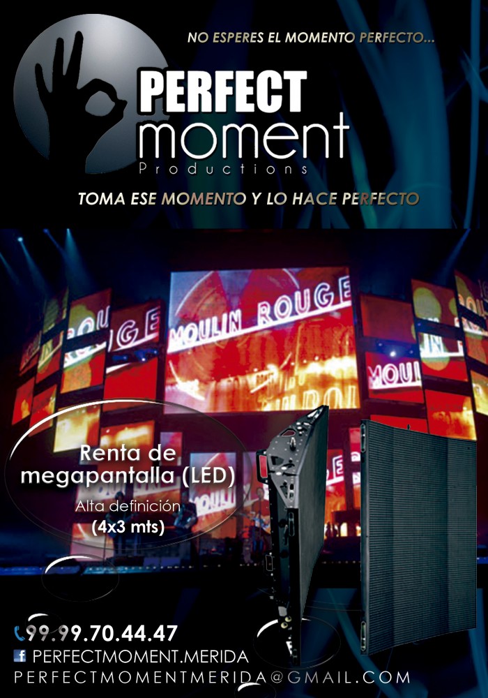 "PERFECT MOMENT" BRINDA SERVICIO A TODO EL SURESTE DE LA REPÚBLICA, SOMOS UNA EMPRESA DEDICADA A LA PRODUCCIÓN DE EVENTOS Y ESPECTÁCULOS. Ofrecemos innovadora tecnología en pantallas de Leds y servicios de vídeo así como audio e iluminación disponibles tanto para interior como para exterior. Nuestros equipos logran convertirse en una excelente herramienta para la presentación de un producto y/o servicio, así como para el éxito de todo un espectáculo de calidad. * Pantallas de leds *Proyectores de video *Circuito cerrado *Plasmas *iluminación arquitectónica *todo en audio CONTACTA NOS Y HAZ CON NOSOTROS TU EVENTO REALIDAD" c
