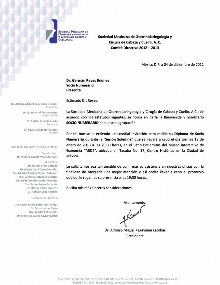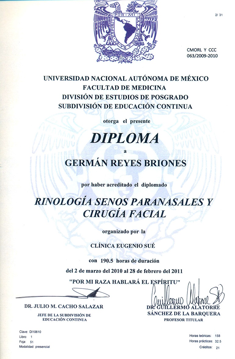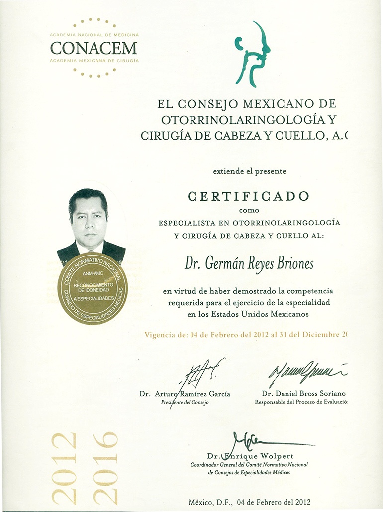 CERTIFICADO POR EL CONSEJO MEXICANO DE OTORRINOLARINGOLOGIA Y CIRUGIA DE CABEZA Y CUELLO No REG. REB-2347/12 Miembro de la Sociedad Mexicana de Otorrinolaringologia y Cirugia de Cabeza y Cuello.