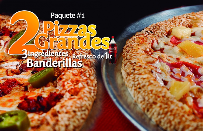 2 Pizzas grandes de 3 ingredientes + Banderillas + Refresco de 1lt